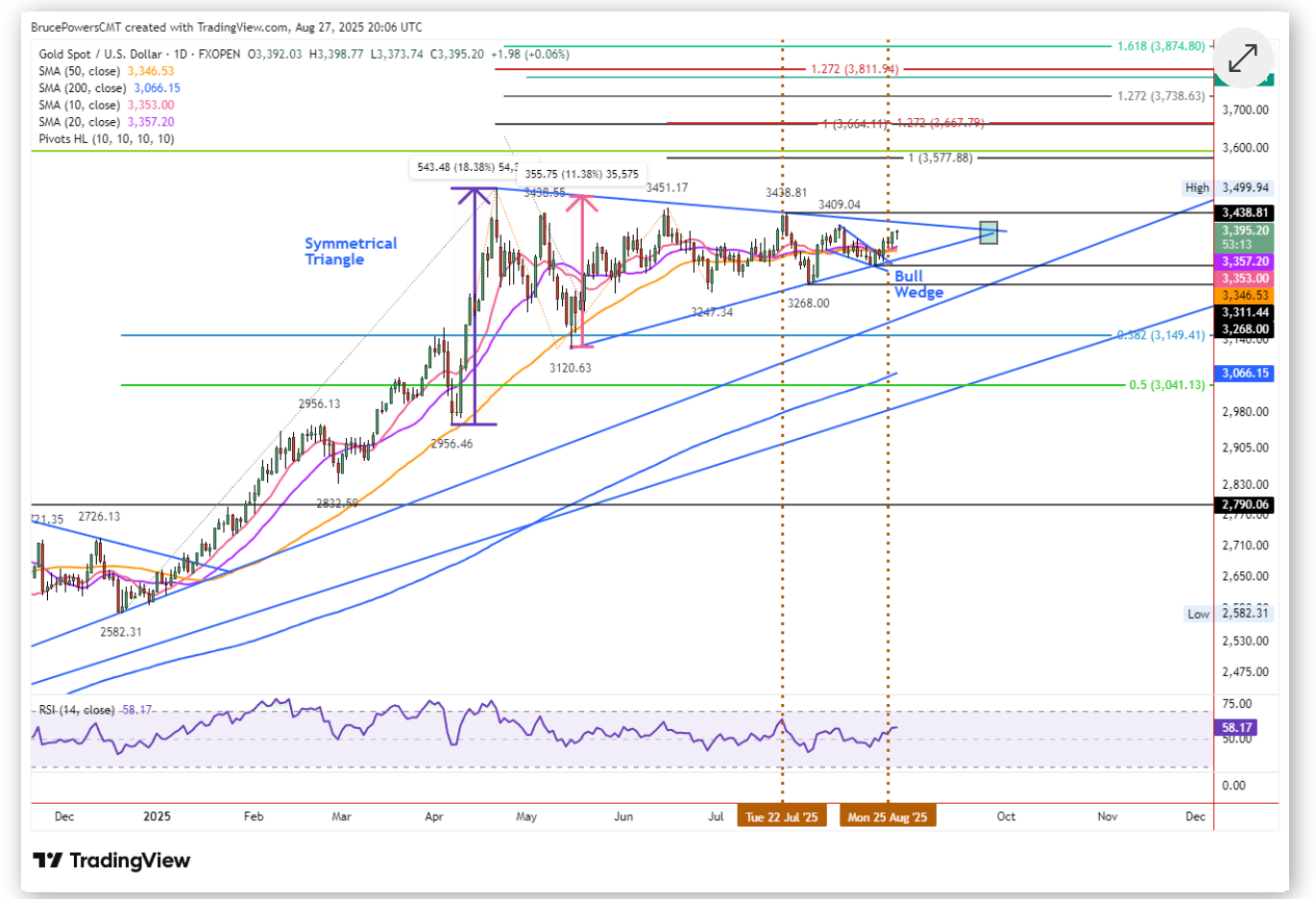 金の価格は水曜日に3399ドルまで強力に上昇し、対称三角形のアッパーバンドの重要な抵抗レベルをテストしています。テクニカルな形状はブレイクスルーが近いことを示しており、上昇目標は3500ドルの歴史的な高値およびそれ以上のスペースを指しています。本稿では20日移動平均線のサポートと週間反転信号を組み合わせて金のブル・マーケットのモメンタムを分析し、同時にビットコインを「デジタルゴールド」として避難所の感情における連動パフォーマンスと比較し、投資家にクロスマーケットの取引視点を提供します。