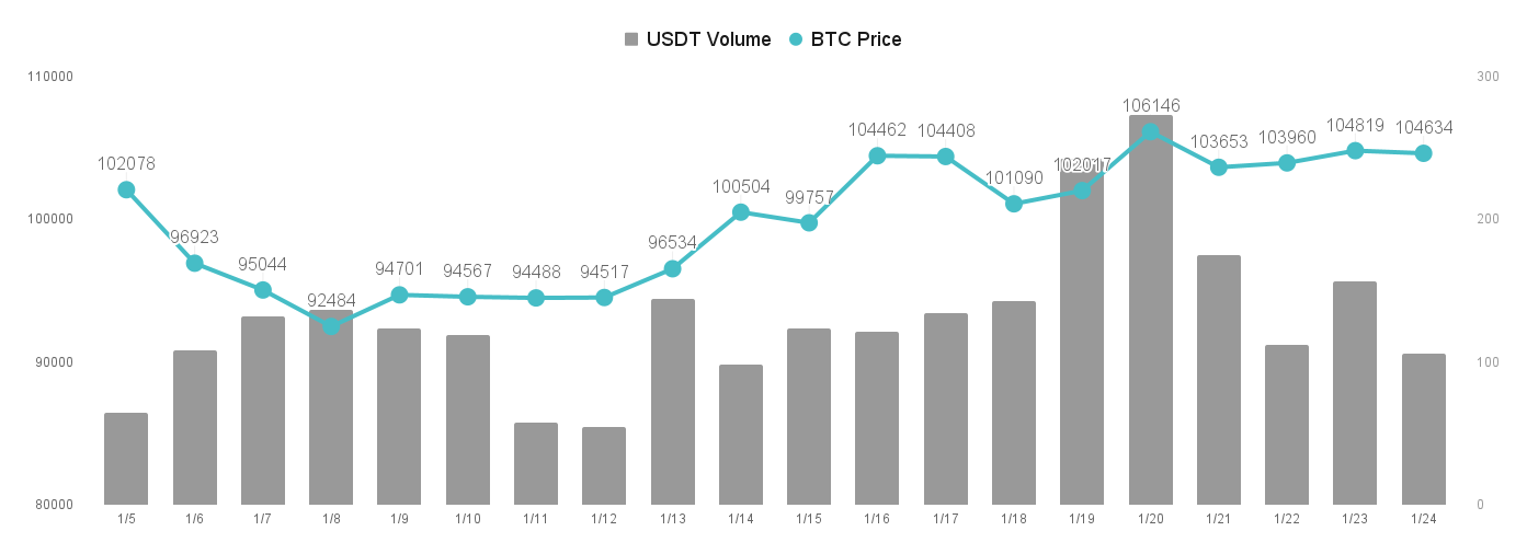 ビットコイン永続先物の資金費用率は0.035%となり、年利率は約13%に相当します。これは12月5日以来の最高値であり、市場の投機心理の高まりを示しています。トランプ大統領の就任と共に、ビットコイン価格は月曜日に史上最高値を更新し、一時的に10万9000ドルを超えました。この上昇は主に契約のハイレバレッジ取引によるものです。私たちは市場がトランプ氏の演説に非常に高い期待を寄せていると考え、投資家の心理も欲深さに変わっていると見ています。