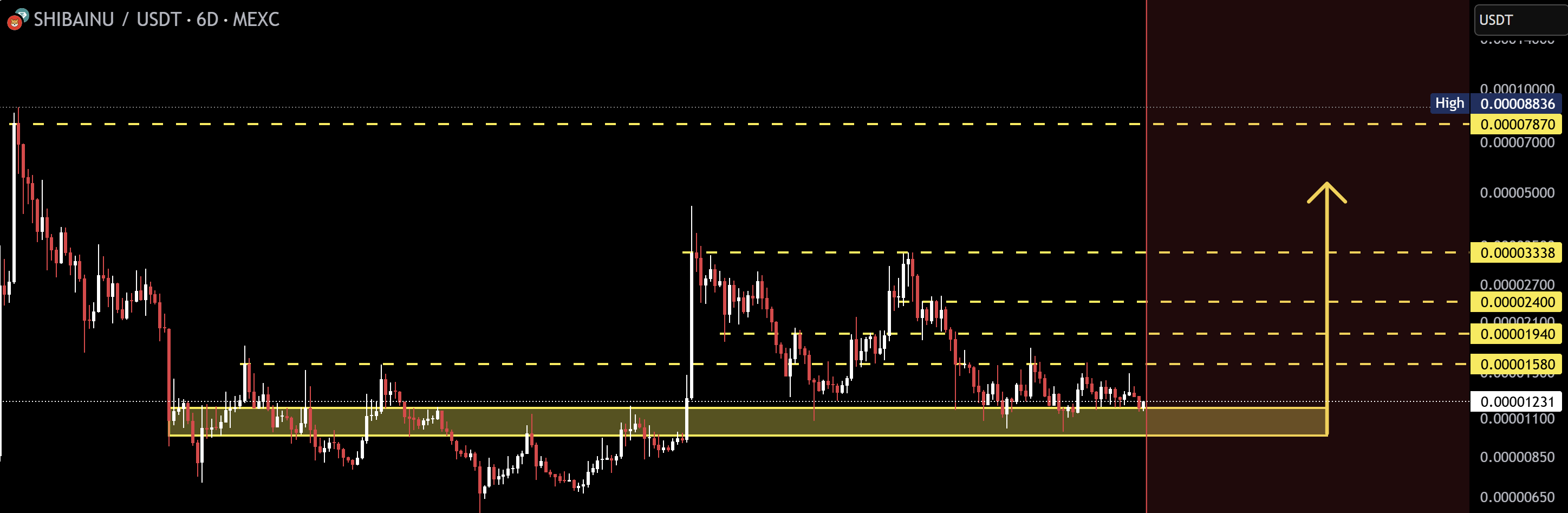 シバイヌは、アナリストの10月1日のTradingViewアップデートによると、6日間のSHIB/USDTチャートで決定的な転換点に近づいています。このペアは、$0.00000850から$0.00001183の間にある長年の需要棚に押し込まれています。この帯域は2022年以降、繰り返し下落を食い止め、市場の長期的な横ばい構造を支えてきました。このゾーンは市場の「分岐点」として強調されており、ここを保持すればマルチレグの上昇に向かう道が開かれ、失うと構造はより深い引き下げへと劣化します。