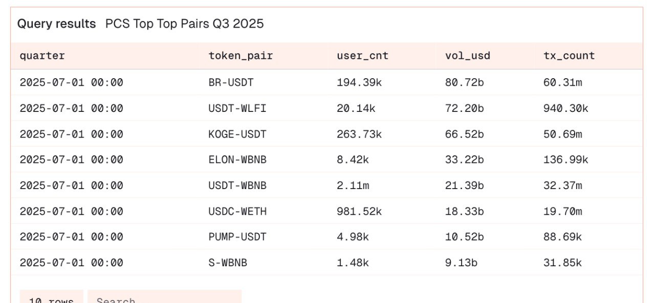 Q3の取引高が最も多かったトークンペアには、BR-USDT ($80.72億)、USDT-WLFI ($72.20億)、KOGE-USDT ($66.52億)が含まれます。また、DEXはQ3において新たな過去最高の1180万人のユーザーに達しました。