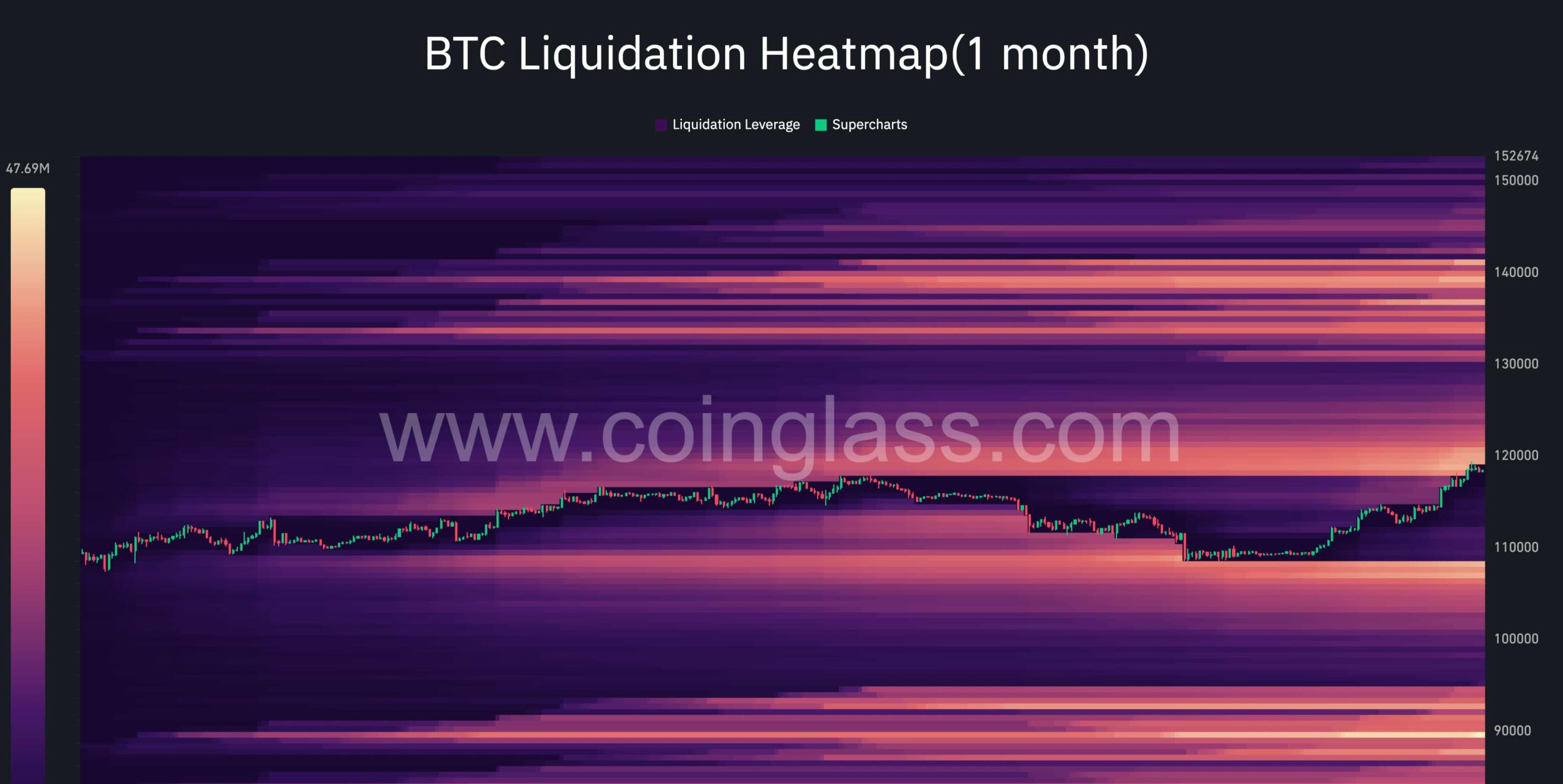 ヒートマップは、現在、$118K--$120K 地域のすぐ上に特に重い流動性の集中が形成されていることを示しています。これは、価格が現在抵抗に直面している正確な場所です。このクラスターは、そのレベルでのショートポジションの蓄積を反映しており、ビットコインが$118K以上で勢いを維持すれば、その流動性が一掃される可能性が大幅に高まります。そのような動きによって引き起こされる強制的な清算は、資産を$120K--$124K 供給ゾーンにさらに押し込む拡張的な上昇の触媒として機能する可能性があります。