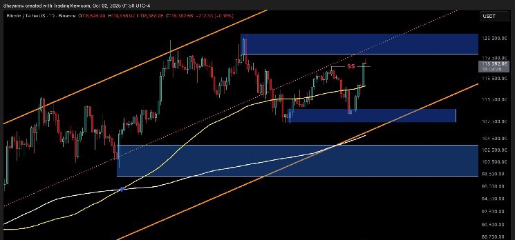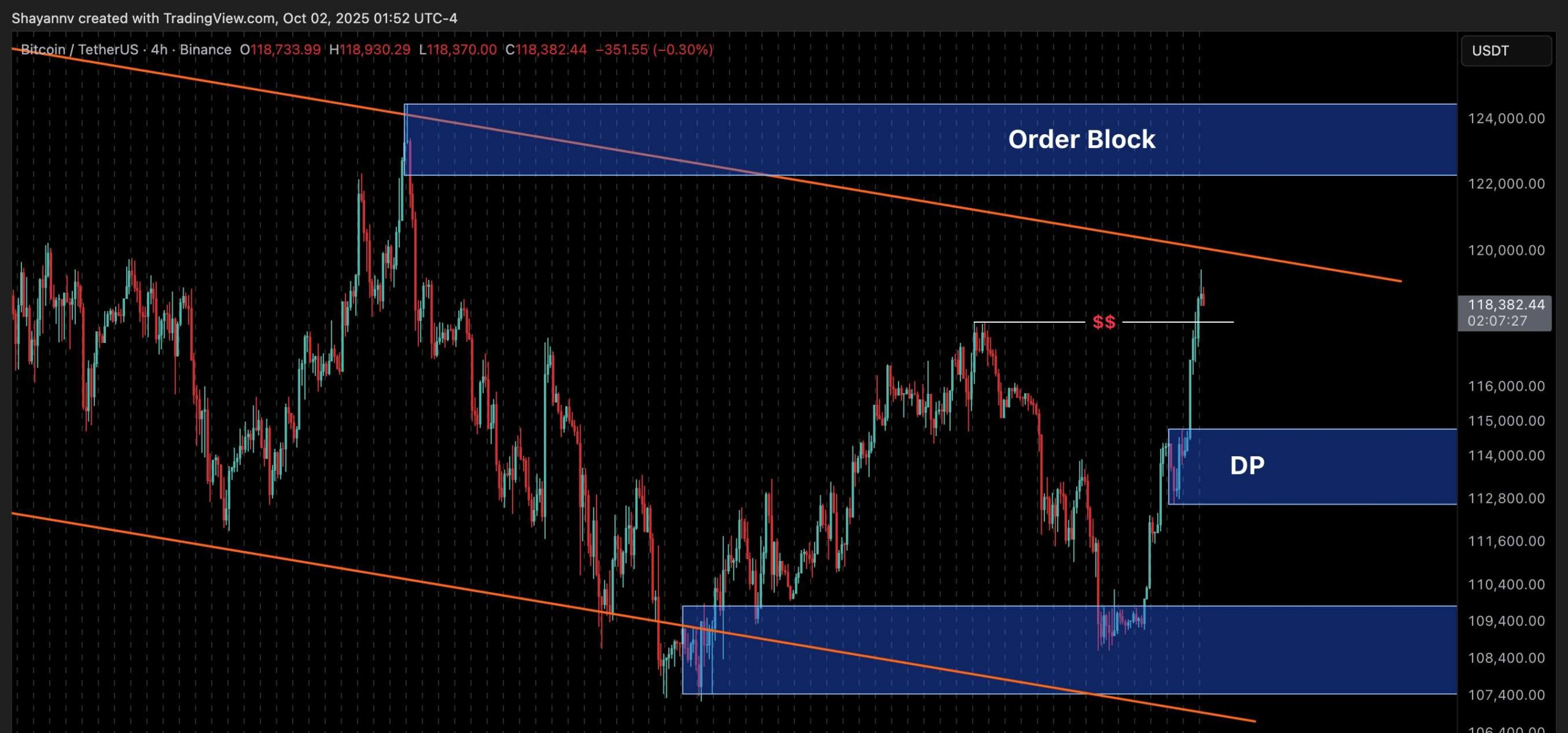 急騰は、最近の重要なスイングハイからの強気のブレイクアウトを確認し、広範な修正構造を弱めています。日足のキャンドルは$118K付近でいくつかの拒否を示していますが、中期構造は依然として建設的です。BTCが$112K--$114K ゾーン --- 現在サポートに変わった --- の上に留まる限り、最も抵抗が少ない道は$120K--$124Kに向かっています。