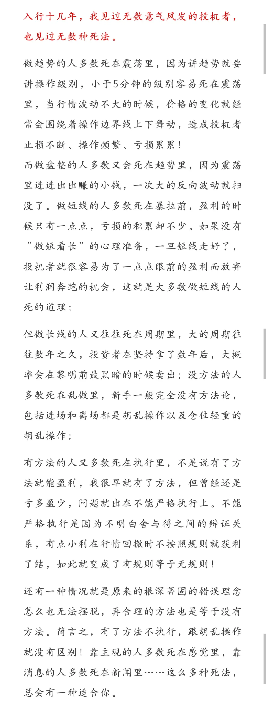 市場に全力で飛び込もうとするなら、まずは逍遥刘强や利弗莫尔などの先輩たちを見てみるといい。軽い場合は負債まみれ、重い場合は家族が崩壊し、妻子に離れられることもある。世界のトップトレーダーでさえ、この運命を免れることは難しい。そのため、盲目的に崇拝することも、盲目的に追随することも避けるべきだ。この業界は成功を定義するのが非常に難しい。利弗莫尔が残した「私の人生は一つの失敗だ」という言葉も、深く考えさせるものだ。