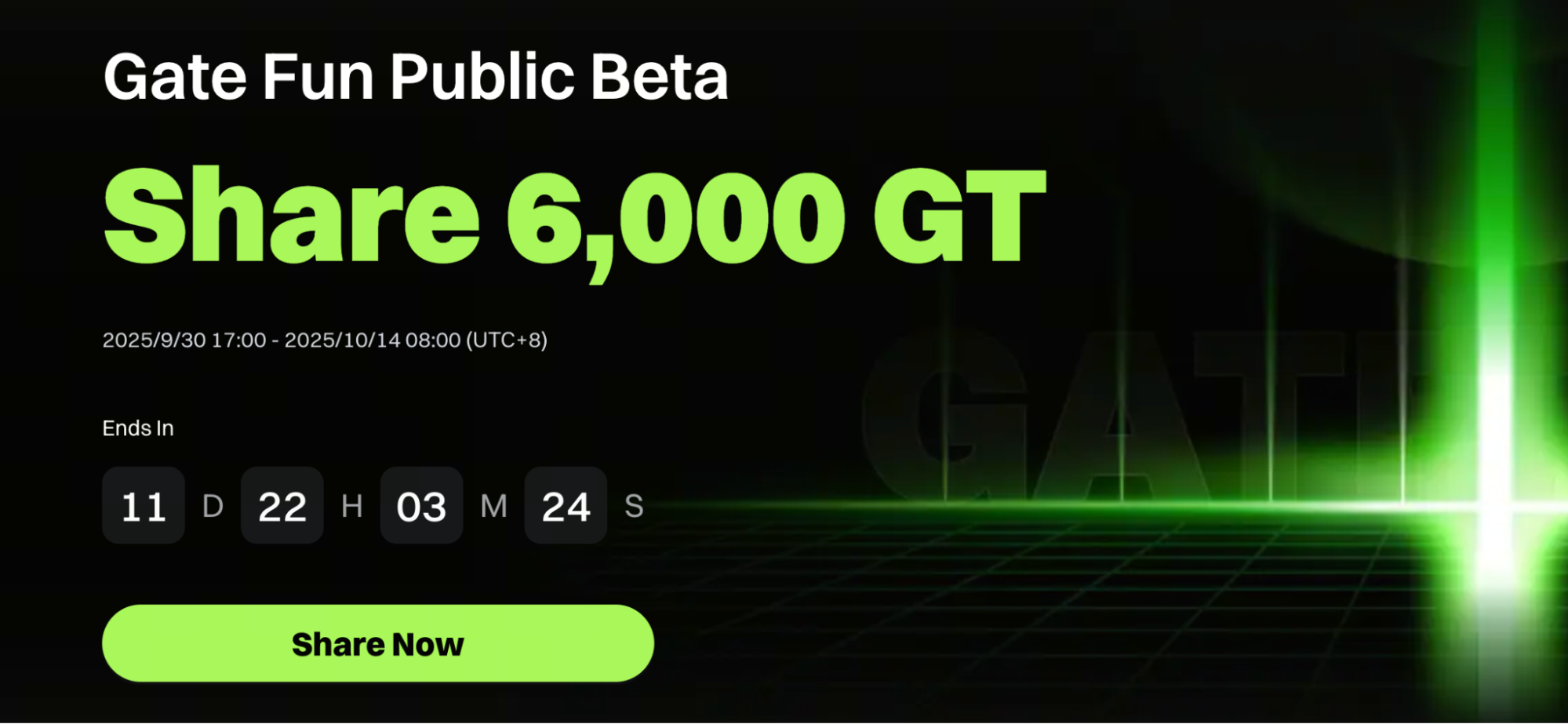 Para assinalar o lançamento do Gate Fun, a plataforma organiza um evento beta público de tempo limitado (30 de setembro de 2025, 09:00 UTC a 14 de outubro de 2025, 00:00 UTC), com um prémio total de 6 000 GT.