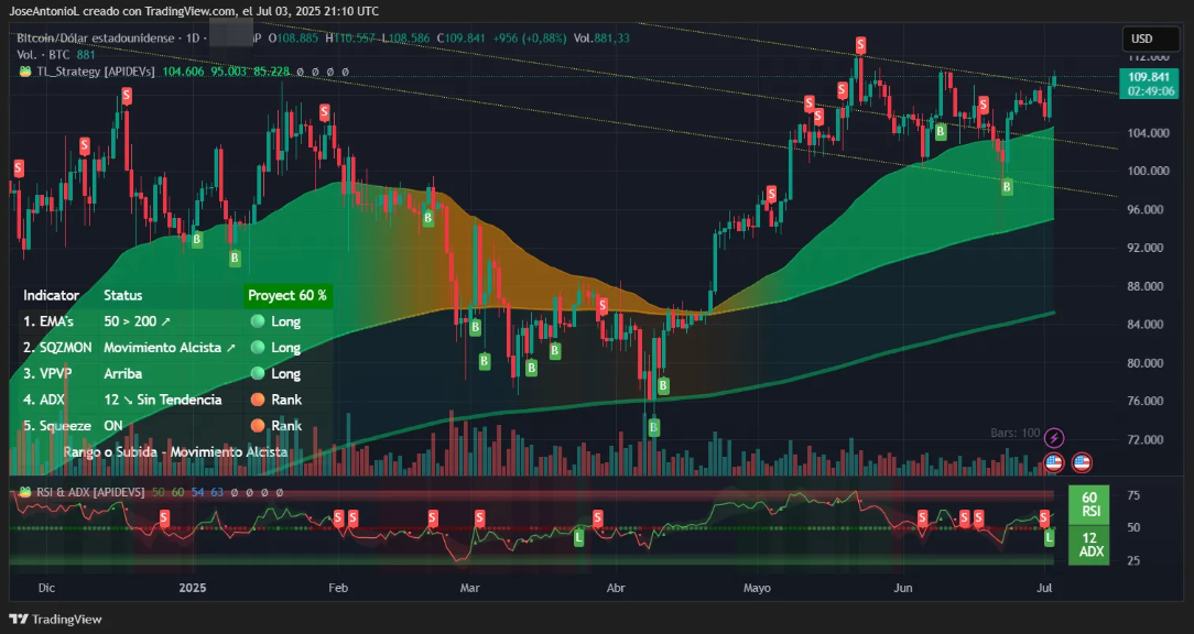 Текущая цена биткойна составляет 109,781 долларов, с умеренным ростом за день, а не с сильным повышением. После краткосрочного прорыва на уровне 110,500 долларов, цена биткойна в настоящее время консолидируется вблизи недавнего максимума. Стоит отметить, что, несмотря на незначительный рост сегодня, удалось успешно прорваться через медвежий канал (желтая линия) сопротивления, сформированный за последние 39 дней (с момента достижения исторического максимума в 111,814 долларов).