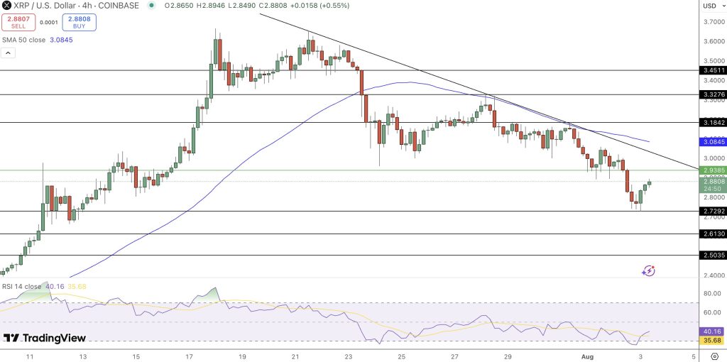 С технической точки зрения прогноз цены XRP кажется медвежьим, так как на 4-часовом графике XRP находится ниже нисходящей линии тренда и 50-периодной скользящей средней (SMA), которая расположена на уровне 3.08 долларов. После пробоя уровня 2.93 доллара эти уровни в настоящее время составляют уровни сопротивления.