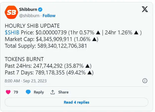Yakın tarihli bir tweette, önde gelen bir Shiba Inu yakma izleyicisi olan Shibburn, Shiba Inu kripto para birimindeki en son güncellemeleri paylaştı. Tweet’lerine göre saatlik altcoin fiyatı yüzde 0,57’lik bir artış göstererek değerini 0,00000739 dolara çıkardı.