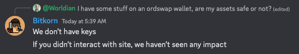 Özellikle bir kullanıcı, düğmenin bir cüzdan boşaltıcı gibi göründüğünü, bunun kripto dolandırıcıları tarafından fonları hortumlamak için kullanılan hain bir araç olduğunu bildirdi. Yazının yazıldığı sırada Ordswap’in web sitesi kullanıcıları otomatik olarak RelayX olarak bilinen rakip bir pazara yönlendiriyordu. Yaşanan çalkantılı olaylara rağmen, bir Ordswap ekip üyesi, projenin Discord sunucusundaki kullanıcılara, ihlalin bir sonucu olarak kullanıcı özel anahtarları veya lıkları üzerinde bildirilen herhangi bir etki olmadığı konusunda güvence verdi. Bununla birlikte, güvenliği ihlal edilen web sitesiyle etkileşime giren kullanıcılar için risk devam ettiğinden dikkatli olunması çağrısında bulunuldu.