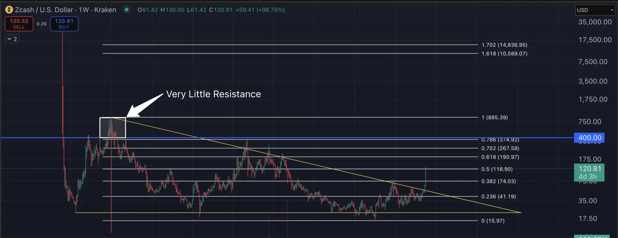 Haftalık grafikte, Zcash, analistlerin sağlıklı bir aralık olarak gördüğü bir konsolidasyon sürecinde. Piyasa gözlemcileri, yapısını XRP'nin tarihsel "kup ve sap" oluşumuna benzetti ve potansiyel uzun vadeli hedefler 350$--450$ aralığında.