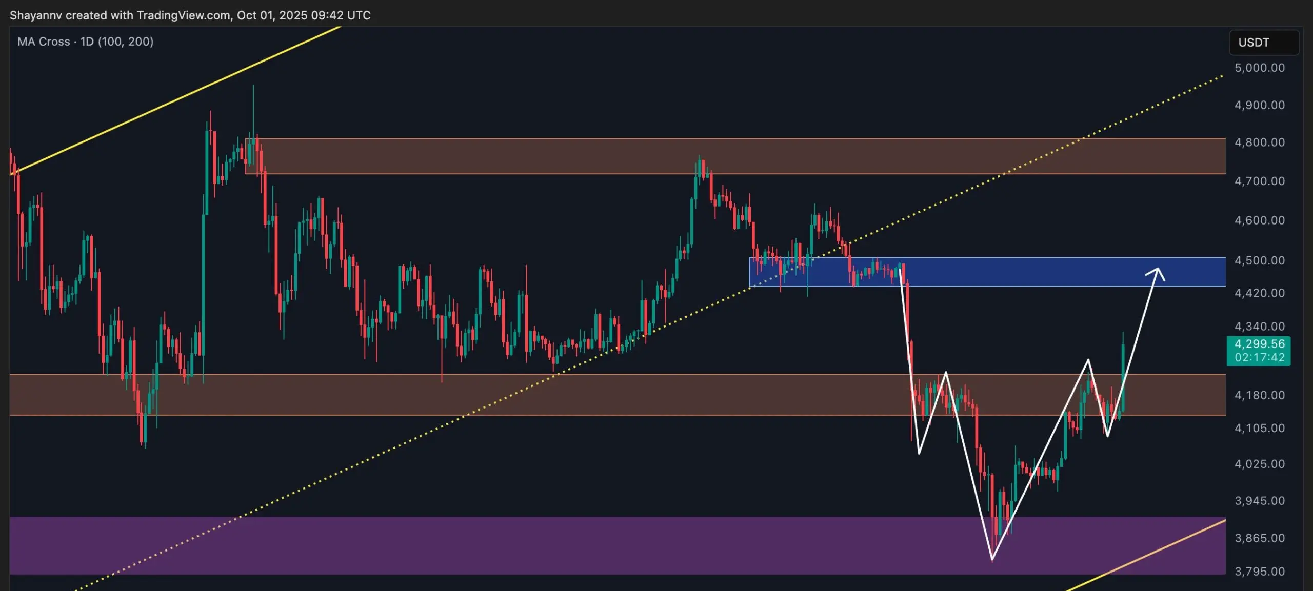 ETH, 4.000 $ destek bölgesini başarıyla savundu ve bu alandan sıçradı. Bu bölge, 100 günlük hareketli ortalama ve önceki talep bloğuyla örtüşüyor, bu da onu teknik olarak önemli bir seviye haline getiriyor.