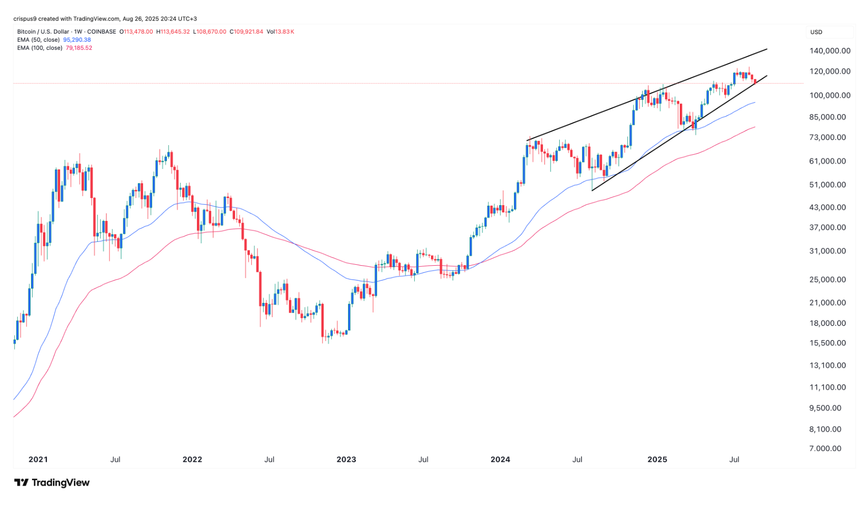 Індикатори коливань, такі як MACD та індекс відносної сили (RSI), демонструють сигнали ведмежого розходження. Якщо буде пробитий ключовий рівень підтримки в 100 000 доларів, ціна може знизитися до 100-тижневого рухомого середнього (поточне значення 79 186 доларів), а потім знову розпочати довгостроковий висхідний тренд.