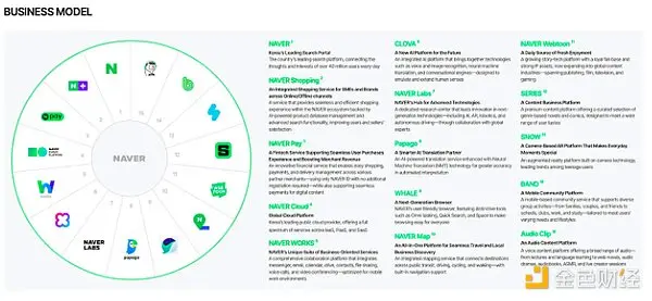 Щоб зрозуміти синергію між Naver та Dunamu, спочатку потрібно зрозуміти корпоративні характеристики Naver. Naver є провідною великою технологічною компанією Південної Кореї. Вона починала з пошукової системи, а сьогодні її бізнес охоплює різні галузі. Компанія вже створила власну екосистему, яка охоплює електронну комерцію (Naver Shopping), зручні платежі (Naver Pay) та контентні платформи (Naver Webtoon).