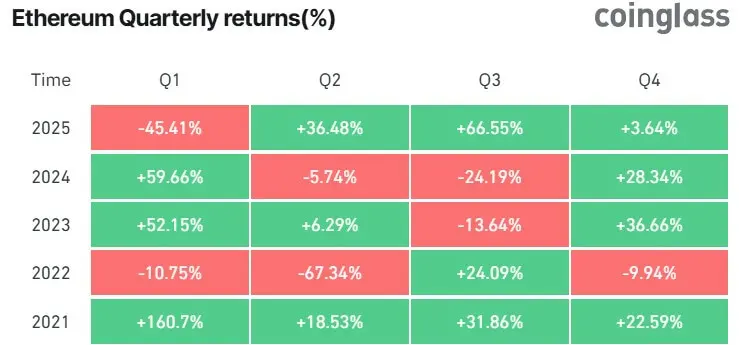 Згідно з даними CoinGlass, ETH зріс на 48,7% у липні та на 18,8% у серпні, перед тим, як незначно коригуватися на 5% у вересні. Незважаючи на цей відкат, монета все ще закрила квартал з приростом 66,6%, досягнувши нового історичного максимуму 4.953 USD у серпні, завдяки стабільному попиту з боку корпоративних фондів та поверненню роздрібних інвесторів.