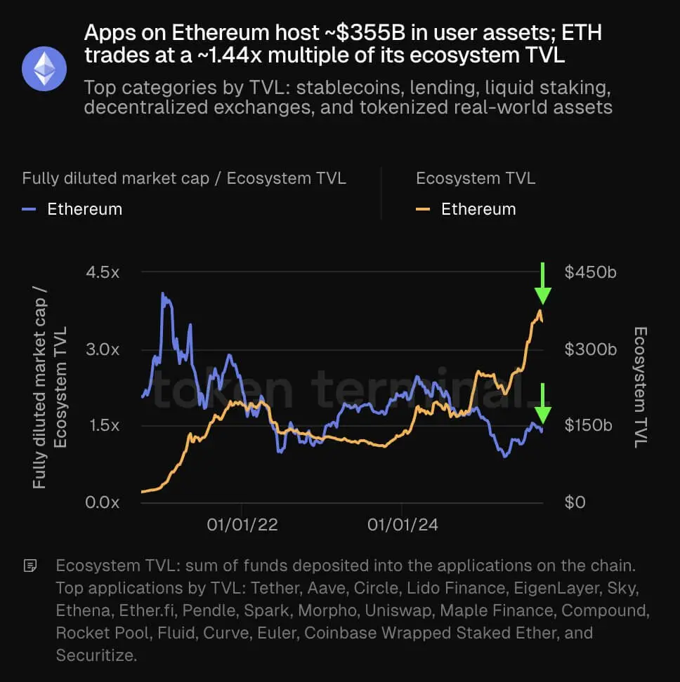 Окрім того, дані з Token Terminal вказують на те, що програми, побудовані на Ethereum – включаючи стейблкоїни, DEX та токенізовані активи – наразі утримують близько 355 мільярдів USD активів користувачів. Наразі ETH торгується за оцінкою приблизно 1,44 рази від загальної вартості заморожених активів (TVL) екосистеми.