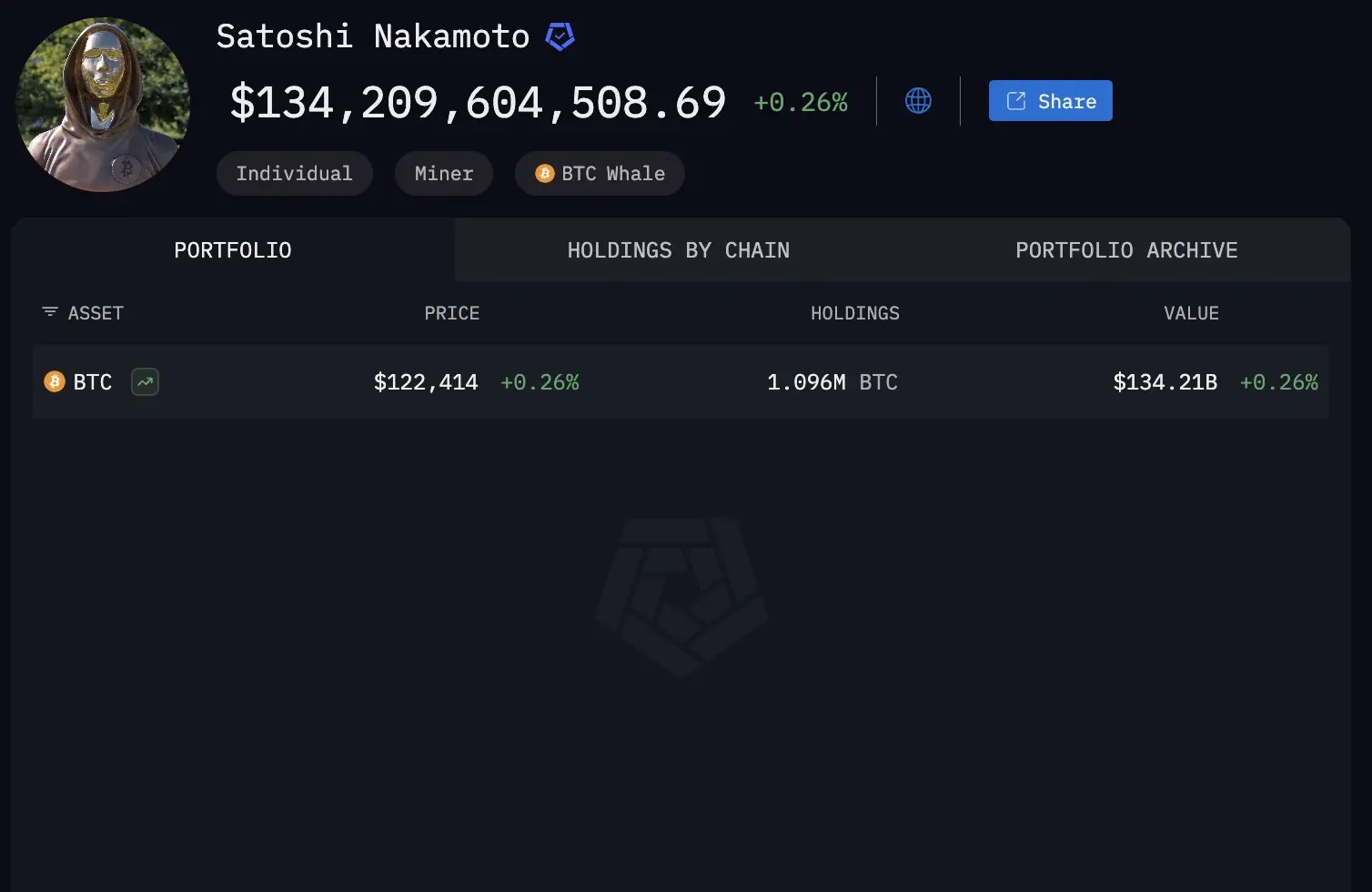 Сатоші Накамото, анонімний засновник Біткойн, наразі утримує 1,096 мільйона BTC, вартість якого становить приблизно 134,209 мільярда USD за ціною 122.414 USD/BTC.