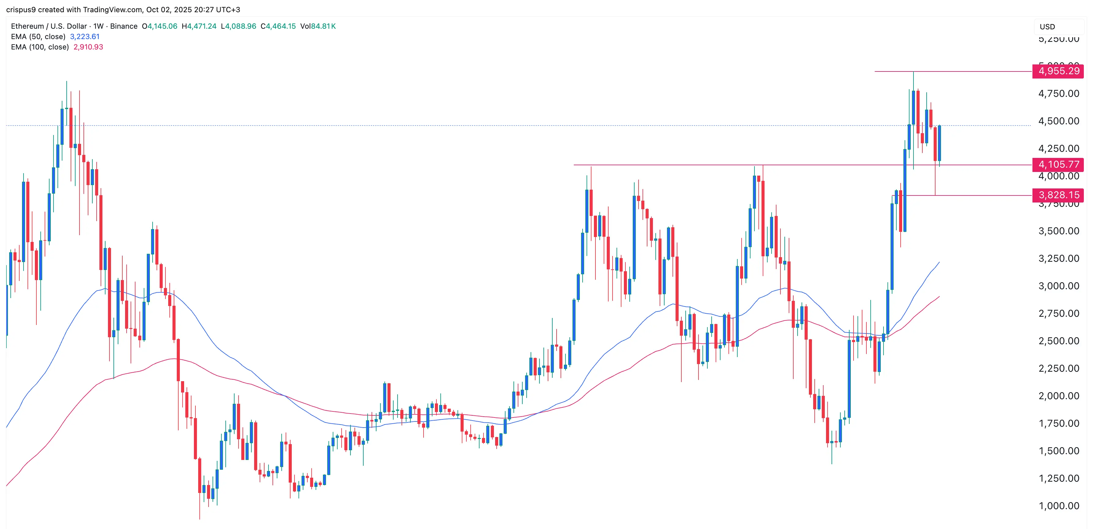 Biểu đồ khung thời gian hàng tuần cho thấy giá Ethereum đã chạm đáy ở mức $3,828 vào tuần trước khi thị trường tiền điện tử sụp đổ. Nó đã hình thành một nến búa, được đặc trưng bởi một thân nến và một bóng dài phía dưới, và là một trong những mô hình nến đảo chiều tăng giá phổ biến nhất.