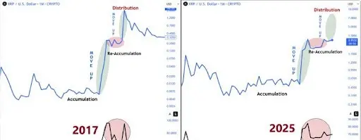 Phân tích kỹ thuật mới cho thấy XRP đang có dấu hiệu lặp lại chu kỳ tăng giá lịch sử năm 2017. Theo một nhà phân tích tiền mã hóa, vào thời điểm đó, XRP đã theo một chuỗi chính xác của việc tích lũy, tăng giá, tái tích lũy, và sau đó là một đợt tăng giá bùng nổ khác trước khi bước vào giai đoạn phân phối.