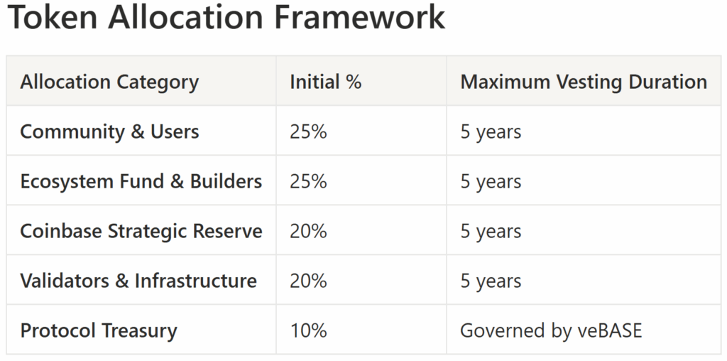 圖示 BASE 代幣分配及最長歸屬期。實際歸屬期將依自適應參數靈活調整。