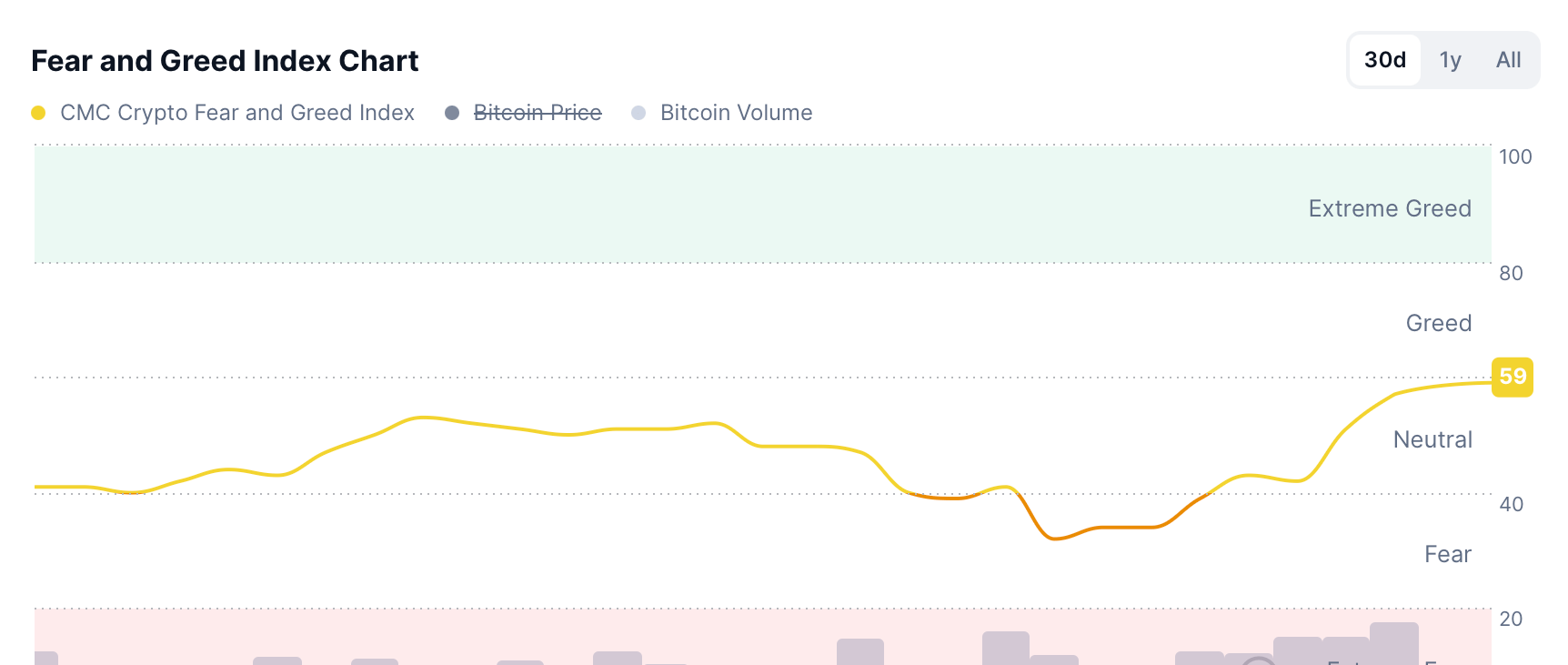 數字資產經濟再次上揚,牛市似乎正在爲繼續這一走勢做準備。截止發稿時,恐懼與貪婪指數爲100中的59---技術上被標記爲“中性”,盡管這是一種已經一只腳懸掛在貪婪領域的中性。