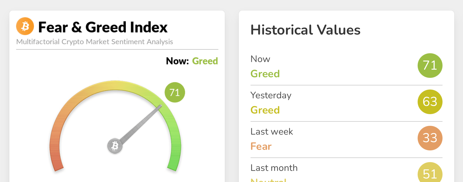 考慮到上周指標在33時還在"恐懼"區域拖拖拉拉,這真是一個快速的躍升。簡而言之,曾經的猶豫不決現在已經連續兩天轉變爲堅定的"貪婪"模式。