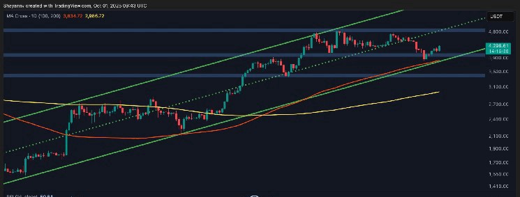 RSI也从超卖区域恢复,现在位于50,表明动量正在回归看涨方。该资产目前正向$4,800的阻力位和大型上升通道的中线推进。从这个区域突破将为未来几个月历史性的ETH反弹开启大门。